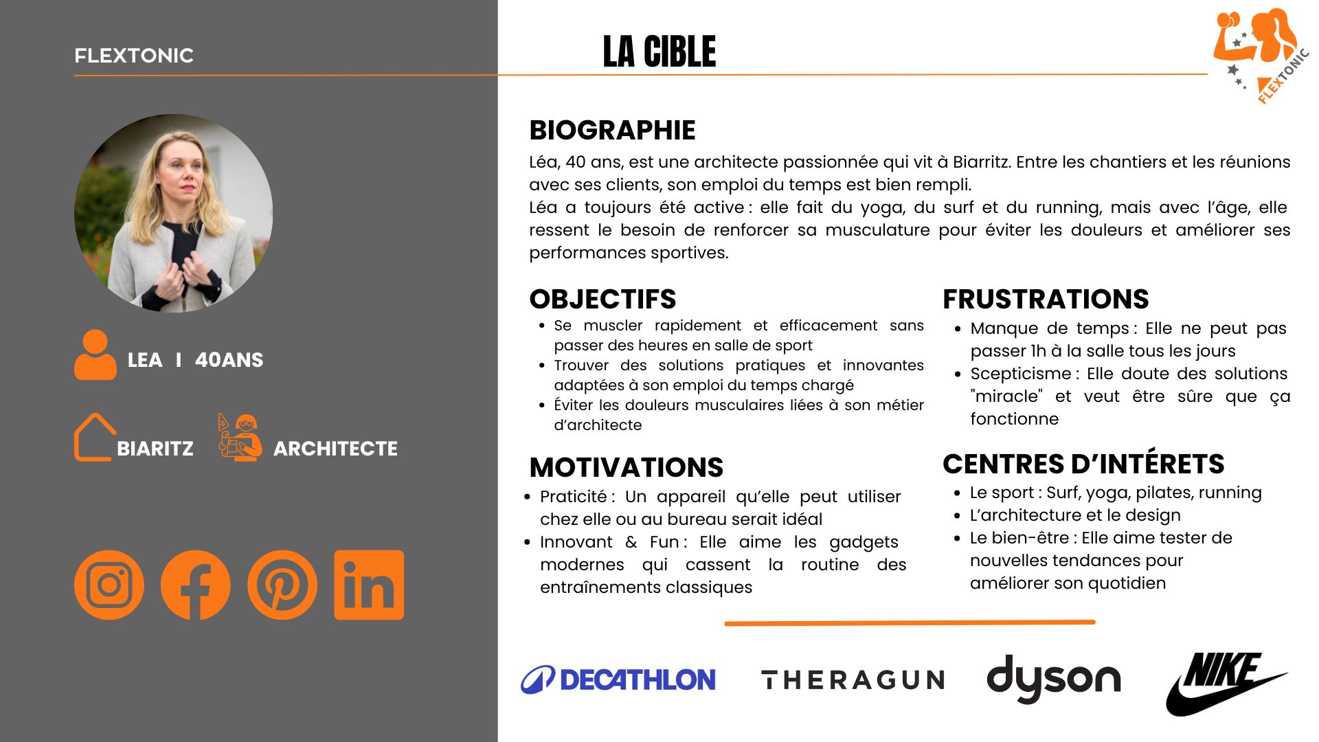Léa représente parfaitement notre cible : une femme active, exigeante et soucieuse de son bien-être, qui cherche des solutions pratiques, rapides et efficaces pour se muscler sans contraintes. Avec un emploi du temps chargé en tant qu’architecte, elle n’a pas le luxe de passer des heures à la salle, mais elle veut néanmoins un corps tonique et sculpté. Son attrait pour l’innovation et le design en fait une cliente réceptive aux produits modernes et esthétiques, qui s’intègrent naturellement à son quotidien.
